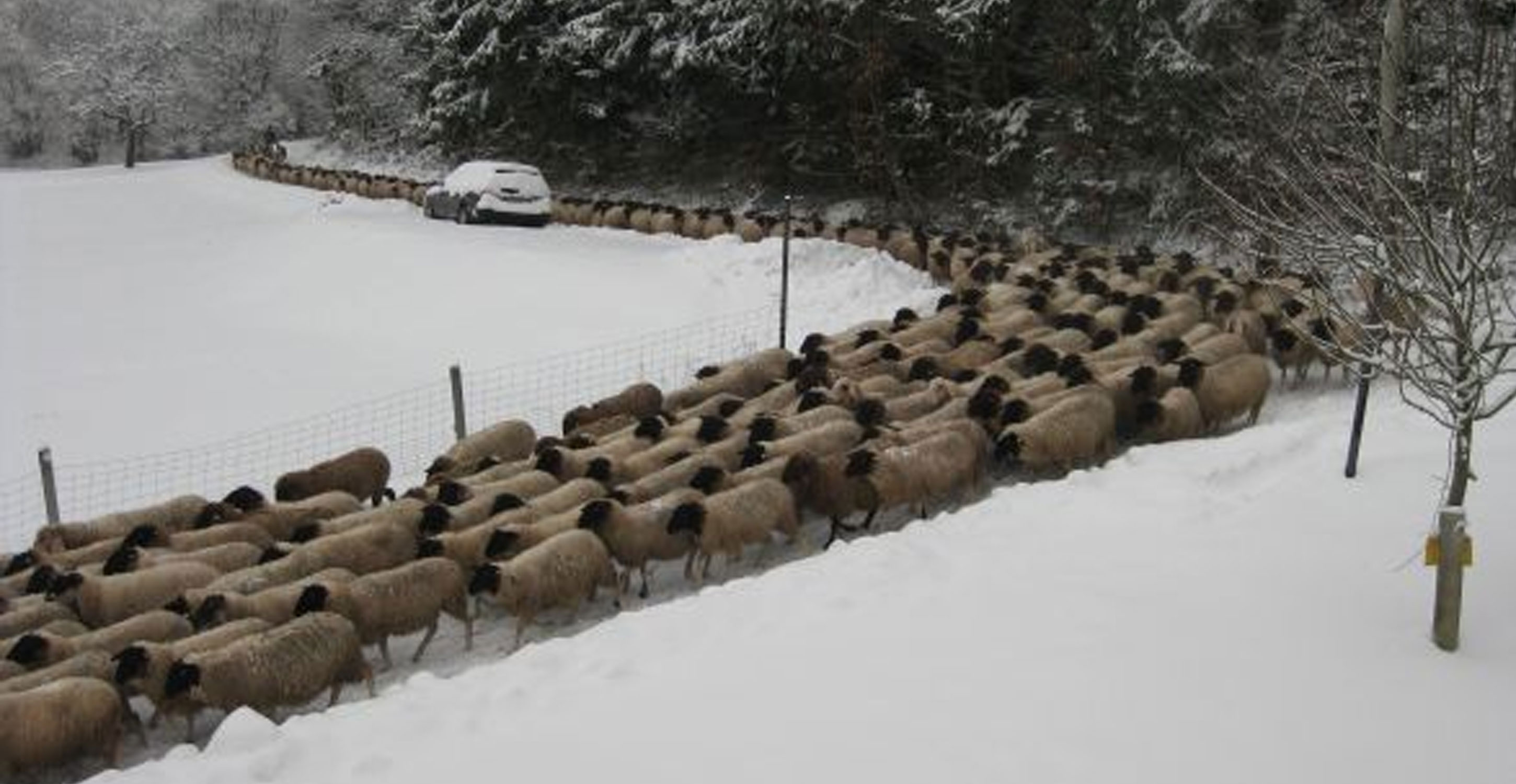 Rhönschafe sind genügsame und unempfindliche Tiere, die Dank ihrer harten Klauen eine gute Marschfähigkeit aufweisen. Darum kann diese Extensivrasse sehr gut in der Landschaftspflege eingesetzt werden. Rhönschafe sind zwar keine ausgesprochenen Fleischlieferanten, passen aber in ihrer Genügsamkeit zu unserem extensiven Standort, der durch viele Streuobstwiesen und Gebüsch geprägt ist. Unsere Stammherde umfaßt ca. 700 Rhönschafe.